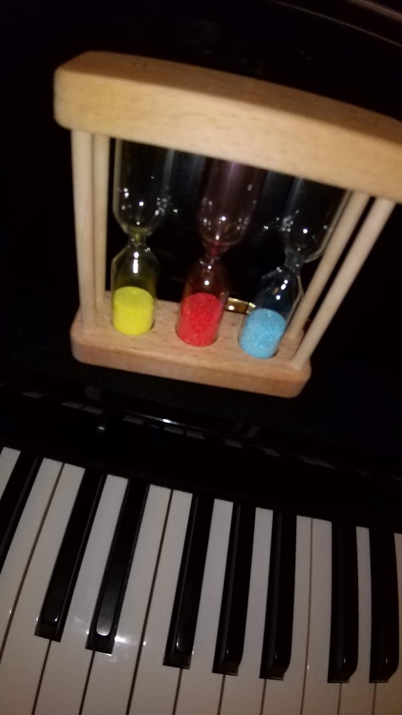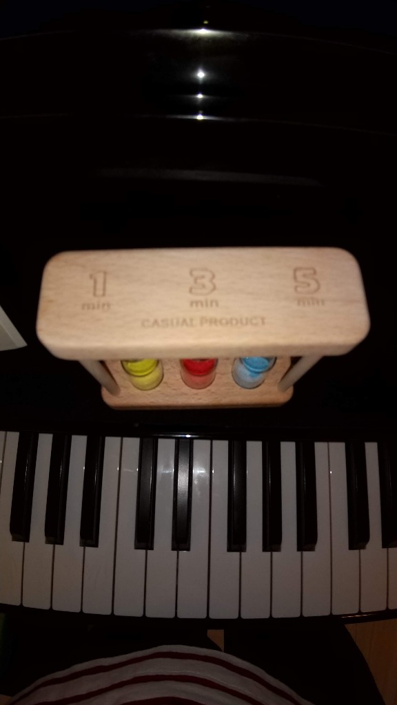 砂時計です。この砂時計優れ物で、1分、3分、5分と砂が色分けされていて必要に応じて弾く回数を選べ、